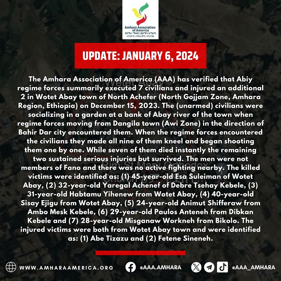 AAA has verified that Abiy regime forces summarily executed 7 civilians and injured an additional 2 in Wotet Abay town of North Achefer Woreda on December 15, 2023.