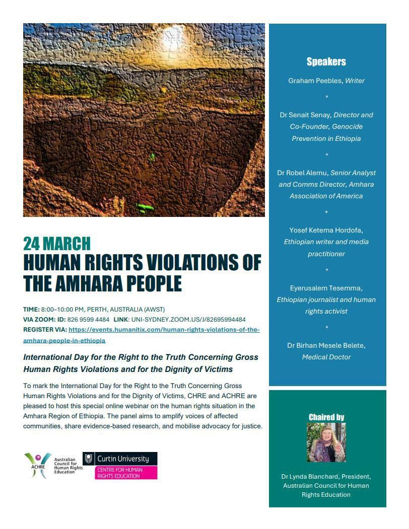 Watch the full recording of the March 24th, 2026 special webinar event entitled "Human Rights Violations of the Amhara People in Ethiopia" hosted by the Australian Council for Human Rights Education (ACHRE) and Centre for Human Rights Education (CHRE) at Curtin University.