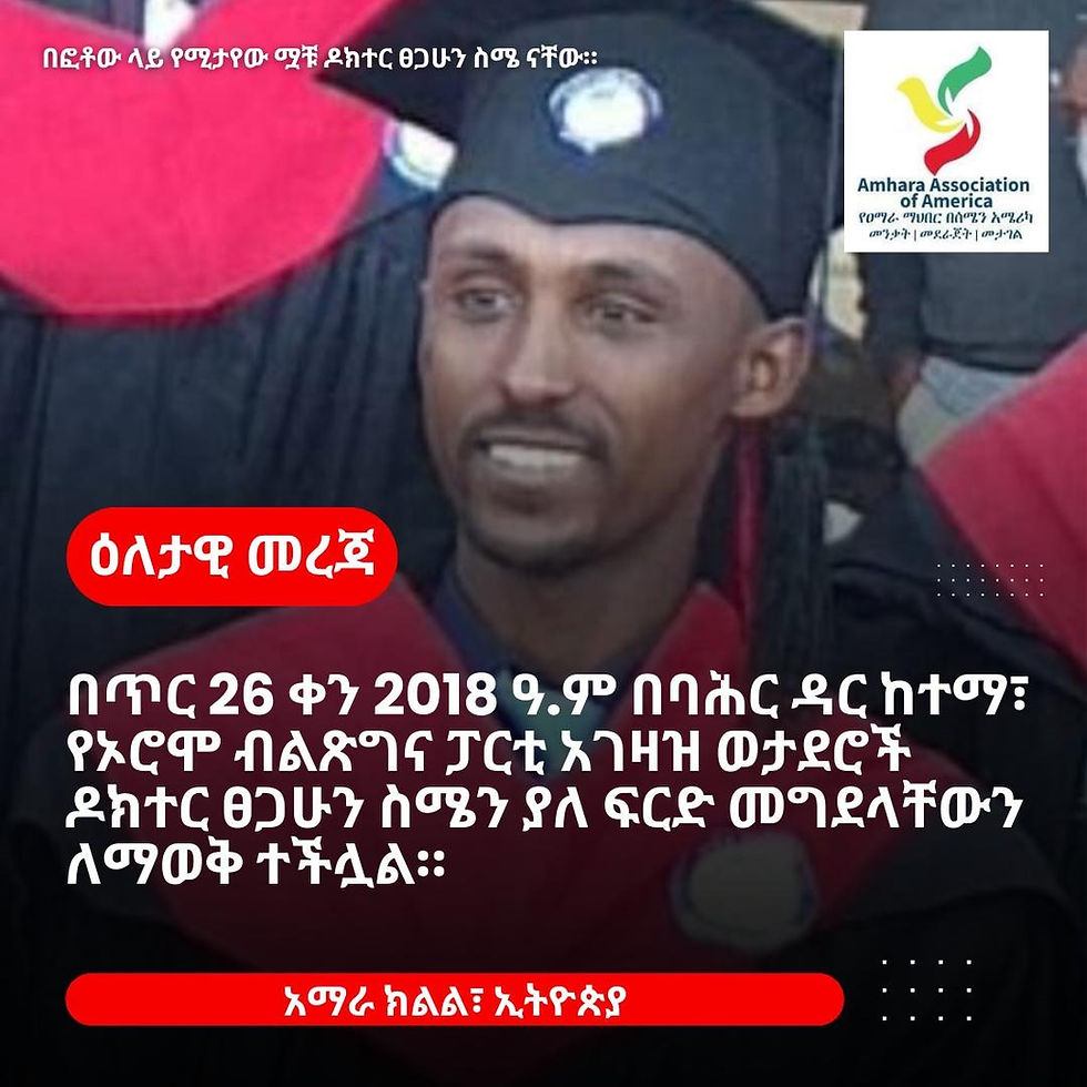 The Amhara Association of America (AAA) has learned that on February 3rd, 2026 Oromo Prosperity Party regime soldiers (regime forces) extrajudicially killed Dr. Tsegahun Simie in Bahir-Dar city (Amhara Region, Ethiopia).